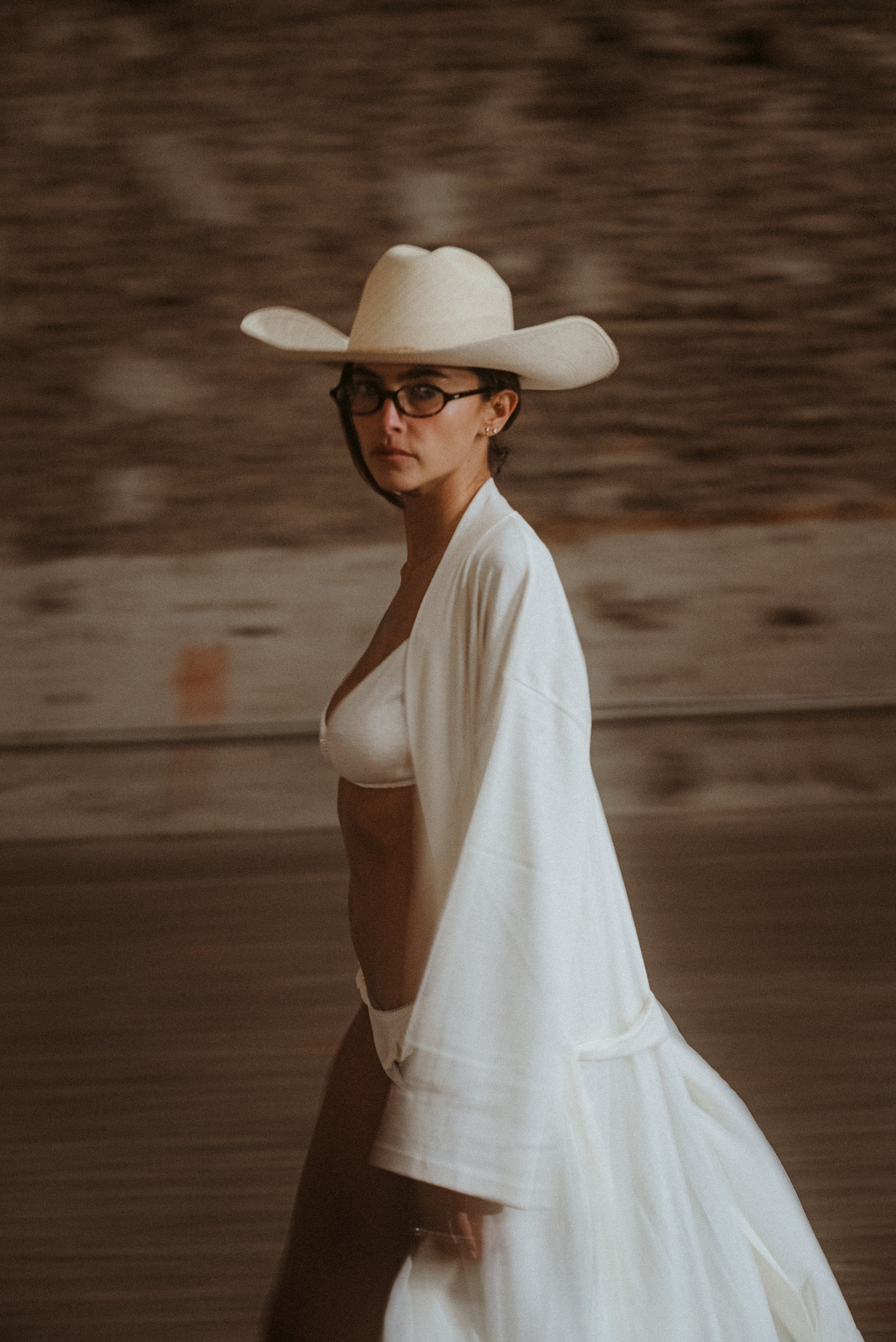 Kimono 100% coton biologique de pointelle. Coupe large et longue. Ceinture à nouer. Taille unique.